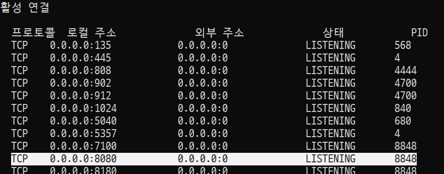 포트를 사용하고 있는 pid를 확인해서 삭제해주는 방법