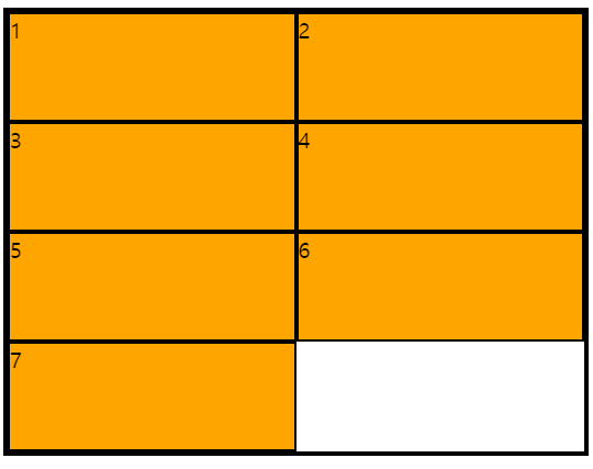 이 상태에서 1번 아이템의 왼쪽을 메우고 싶으면 grid-auto-flow의 값을 columns dense로 주면 된다.