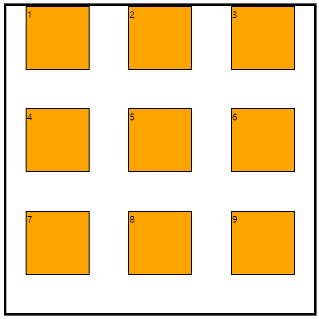justify-content와 align-content를 사용할 수 있는 기본 조건은 오렌지 영역인 grid content를 제외하고 행축과 열축에 정렬할 수 있는 빈 공간이 존재해야 한다는 것이다.
