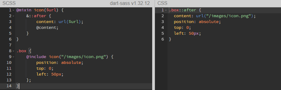 @include의 중괄호 사이(= 스타일 블럭)에 있는 내용은 @mixin의 @content 규칙으로 들어가게 된다.