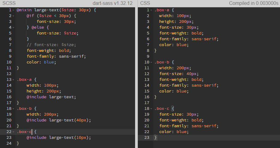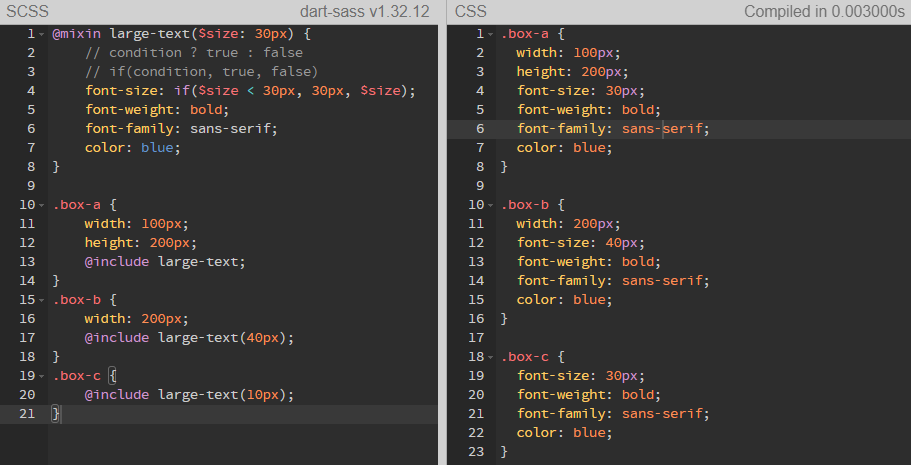 @mixin은 단순히 css의 속성과 값만 적는 것이 아니라 Sass에서 정의할 수 있는 다양한 내용을 @mixin 내부에서 활용할 수 있다.