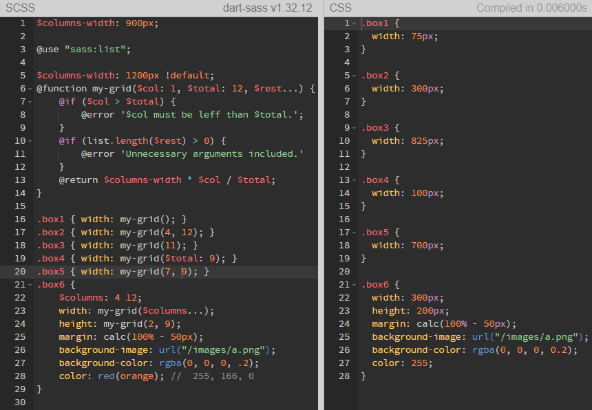함수를 작성할 때 SCSS에 내장되어 있는 다양한 전역 함수와 이름을 겹치게 하지 않기 위해 두 개의 단어를 조합해서 이름을 작성하는 것이 좋다.