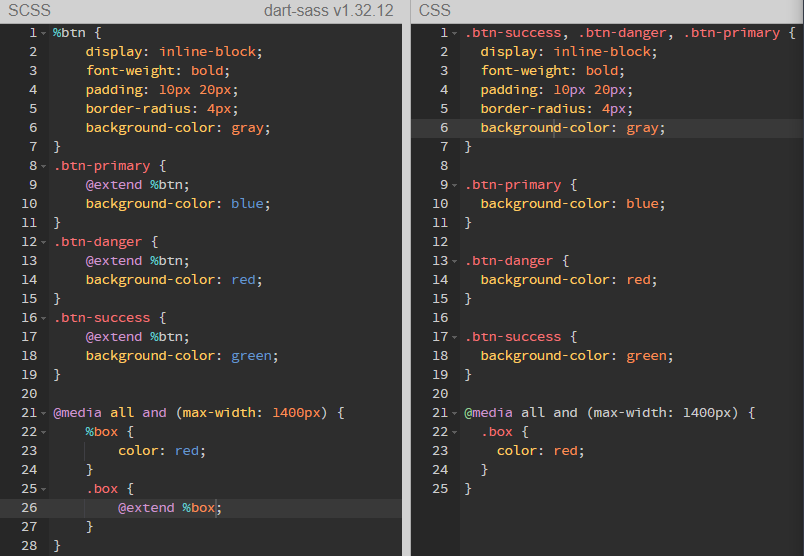 주의사항은 placeholder 선택자는 범위를 신경써야 하기 때문에 media 규칙 내에서 사용할 placeholder 선택자는 그 안에서 정의되어 있어야 한다는 것이다.