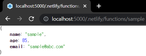 이제 npm run dev:netlify 명령을 입력하여 서버를 오픈한 뒤 http://localhost:5000/.netlify/functions/sample 주소로 이동하면 함수에서 반환하고 있는 객체 데이터가 출력되는 것을 볼 수 있다.