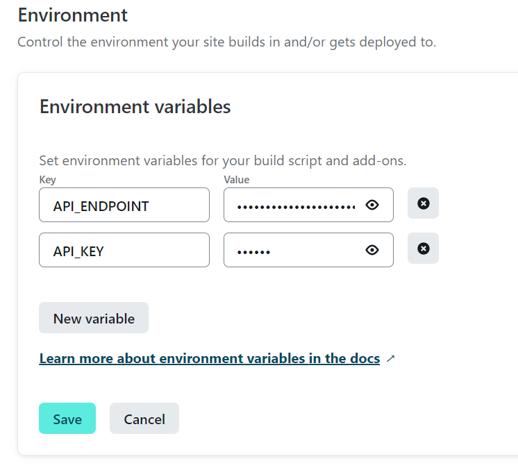 로컬에서 개발을 할 때는 .env 파일을 제공해서 config 메소드로 읽을 수 있게 만들어주고, 실제 netlfy 서비스에서는 환경변수를 직접 작성해줘야 한다.
