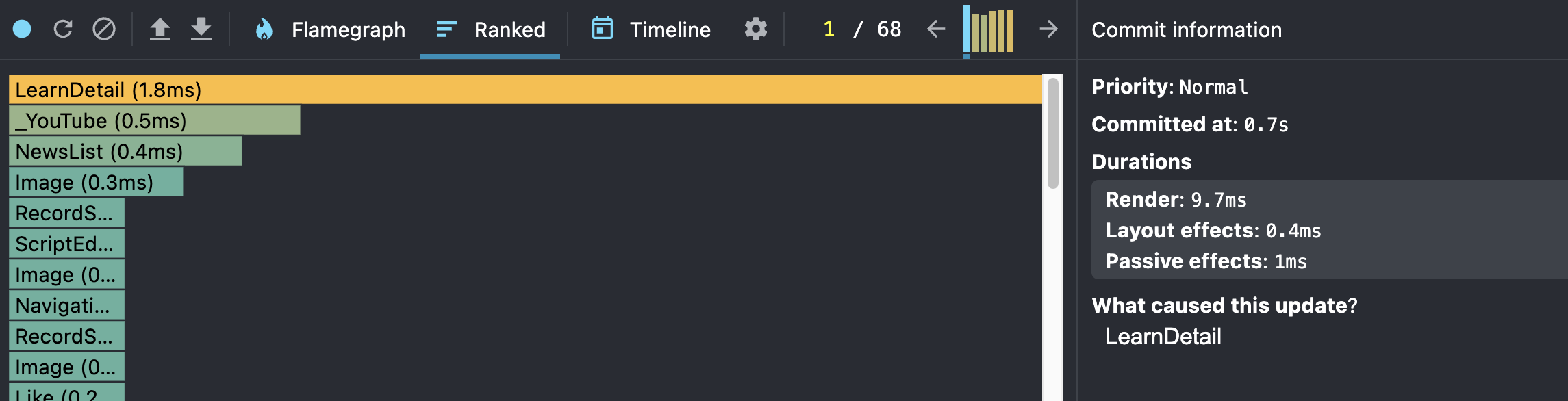 학습 상세 페이지에서 스크립트의 두 번째 문장 시작 지점까지 동영상을 재생하는 동작을 프로파일링 한 결과입니다. 10초도 안되는 시간동안 렌더링이 68번이나 일어난 것을 볼 수 있습니다.