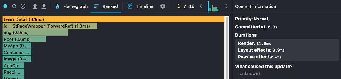 Profiler는 커밋별로 성능 정보를 그룹화합니다. 커밋은 프로파일러 상단 근처의 막대형 차트에 표시됩니다. 바의 색상과 높이는 렌더링에 걸린 시간을 의미합니다. 이 도구를 통해서 불필요한 렌더링을 줄이고 최적화를 할 수 있습니다.