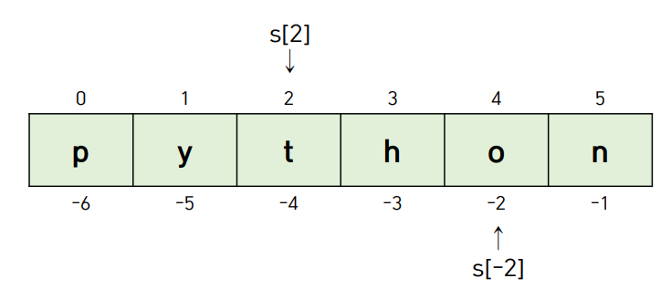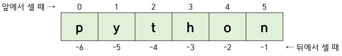 - 뒤에서 셀 때는 음수를 사용. 제일 마지막 문자가 -1번이며 앞으로 갈수록 1씩 감소