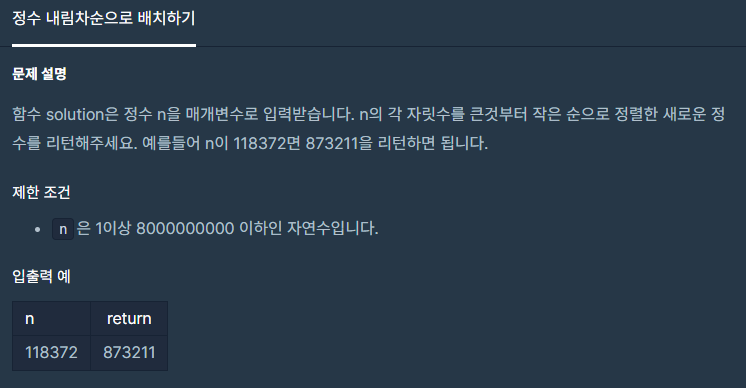 프로그래머스 lev1 정수 내림차순으로 배치하기