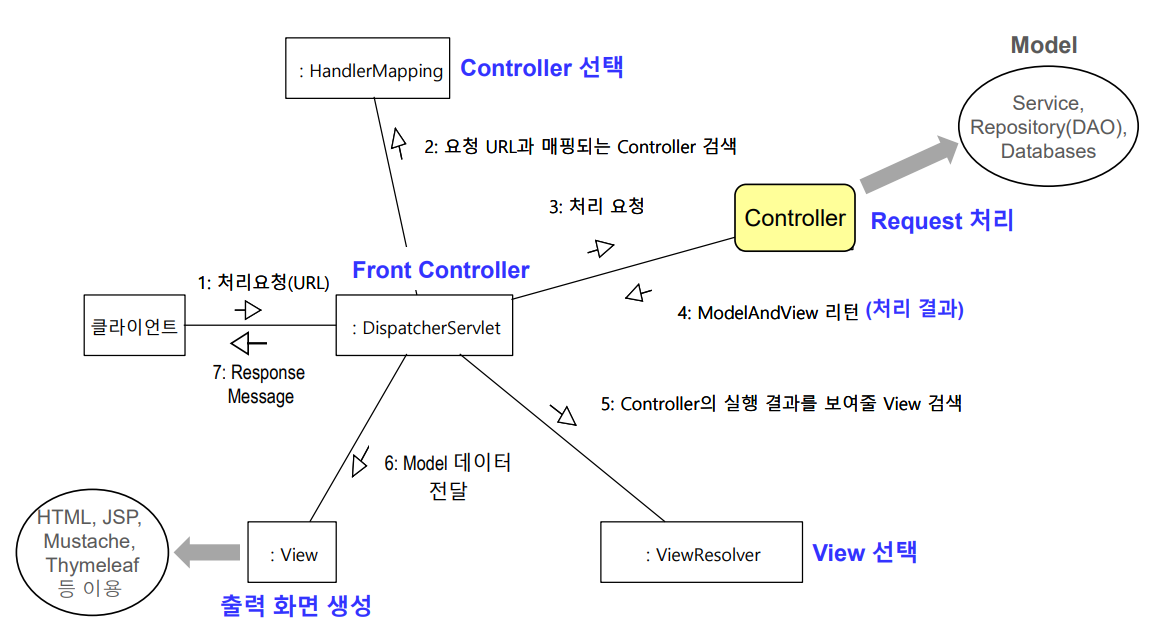 - DispatcherServlet: Client의 요청(request)을 받아 Contoller에게 전달. Controller의 처리 결과를 View에 전달하여 응답(response)을 생성하도록 함(front controller)