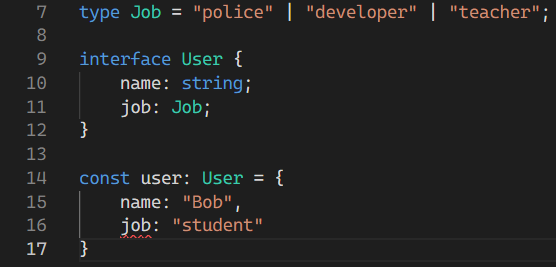 job 프로퍼티는 위에서 선언한 string만 사용할 수 있다.