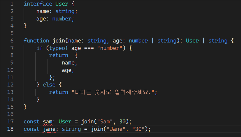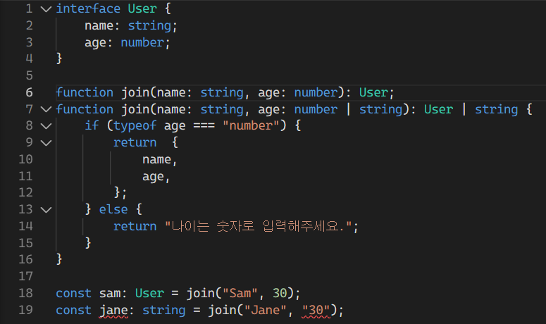 나이는 number 혹은 string을 받을 수 있고, 나이가 숫자라면 User를 반환하고 아니라면 string을 반환한다.