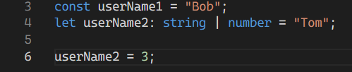 userName2의 타입은 따로 명시하지 않았지만 3으로 바꾸면 에러가 발생한다.