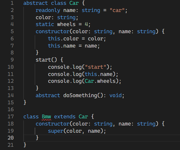 추상화는 프로퍼티나 메소드의 이름만 선언해주고 구체적인 기능은 상속받는 쪽에서 구현해주는 것을 의미한다.