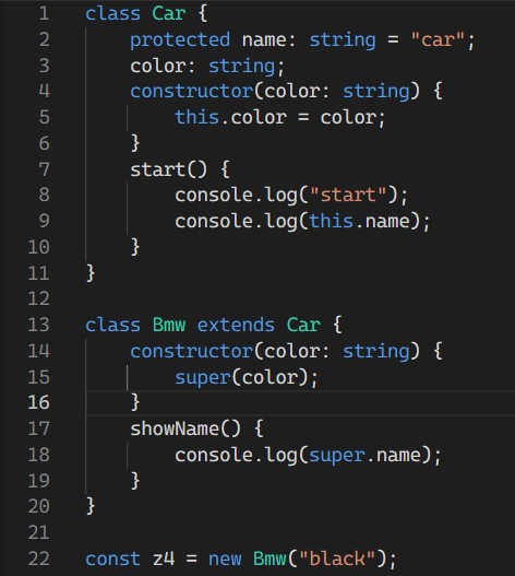 super의 name, 즉 Car의 name이 public이기 때문에 자식 클래스 내부에서 접근해도 문제없이 사용이 가능하다.