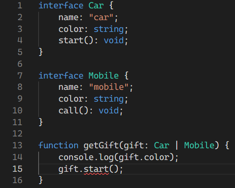 이렇게 동일한 속성의 타입을 다르게 해서 구분할 수 있는 것을 식별 가능한 유니언 타입이라고 한다.