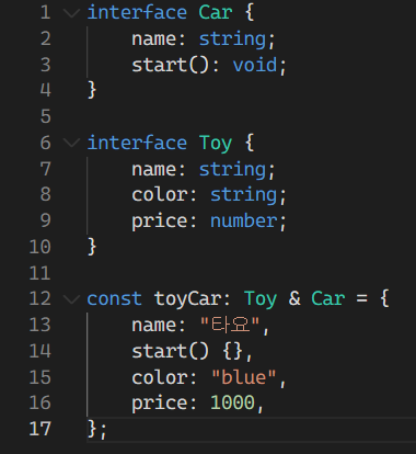 유니언이 A 또는 B 처럼 or의 의미였다면 교차 타입은 and를 의미한다.