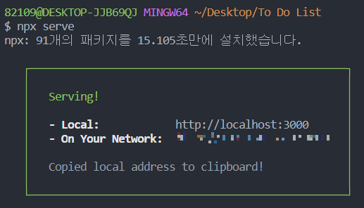 만약 port가 사용 중이면 npx serve -l 포트번호 커맨드로 다른 port로 띄울 수 있다.