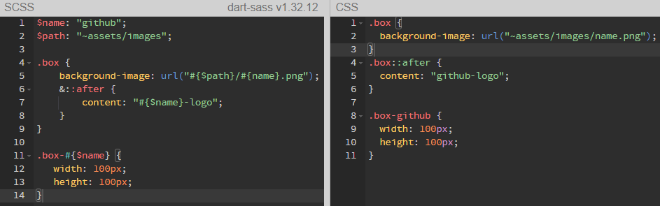 자바스크립트의 템플릿 리터럴의 보간처럼 SCSS도 보간을 사용할 수 있다.