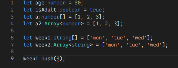 week1의 타입은 문자열 배열이기 때문에 3을 넣으려고 하면 빨간 줄이 생기는 것을 볼 수 있다.